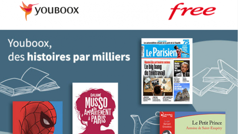 Lancée en avril 2020, l’offre payante de Youboox spécialement élaborée pour les abonnés Freebox et Free Mobile, permet d’accéder en illimité à des milliers d’ebooks, BD et comics mais également à deux nouveautés de taille, des milliers de livres audio mais aussi à des titres de presse (Libération, L’Équipe, Le Figaro, Les Echos, L’Express, Sciences et Avenir, Paris Match, Elle, Les Inrockuptibles).