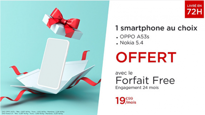 Il y a une semaine, Free lançait une nouvelle offre sur le site Veepee, qui devait se terminer ce mardi à 15 juin à 6h00. Cette offre vient d’être prolongée de 3 et se terminera donc le 18 juin à 6h00. Dans cette promo, Free donne le choix entre deux modèle de smartphones offerts : un mobile 4G OPPO A53s 128 Go Noir ou Mobile 4G Nokia 5.4 128 Go Bleu. Celui de votre choix vous sera livré gratuitement pour tout abonnement au forfait Free Mobile illimité proposé au tarif habituel, soit 19,99 euros par mois ou 15,99 euros par mois pour les abonnés Freebox (et même 9,99€/mois pour les abonnés Freebox Pop).
