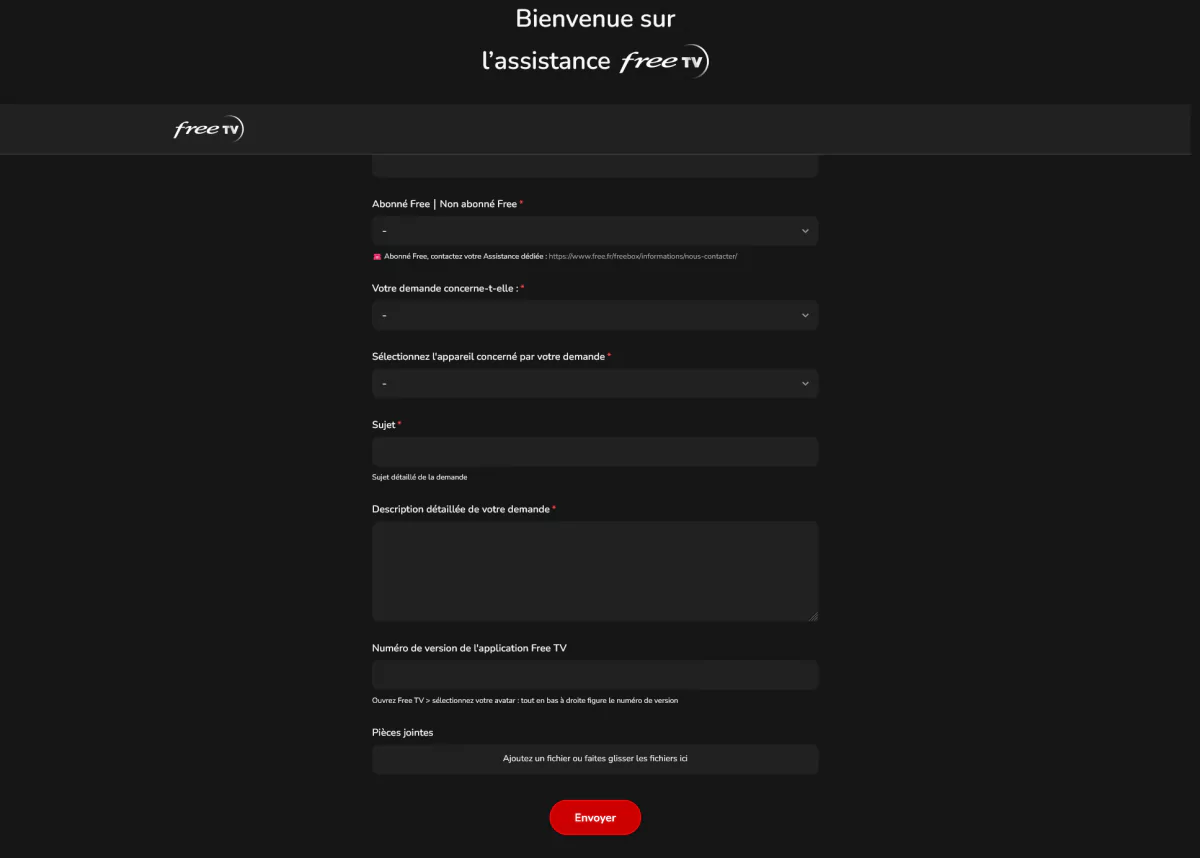 En effet, depuis peu, la page d’accueil a été complètement revue pour devenir une page dédiée à prendre contact directement avec l’assistance de l’opérateur concernant le service Free TV. Un formulaire classique permettant de saisir sa problématique, son nom, son adresse mail, et même de joindre des images de votre problème rencontré.
