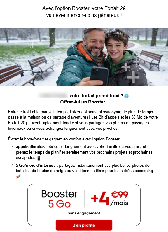 Si vous cherchez à donner un coup de fouet à votre forfait à 2€, Free Mobile met en avant dans un mail envoyé à ses abonnés son Booster 5Go. De quoi “réchauffer” votre forfait qui pourrait se sentir un peu frileux avec sa petite enveloppe de data, avec l’intégration des appels illimités et de 5Go supplémentaires, pour 4.99€/mois.
