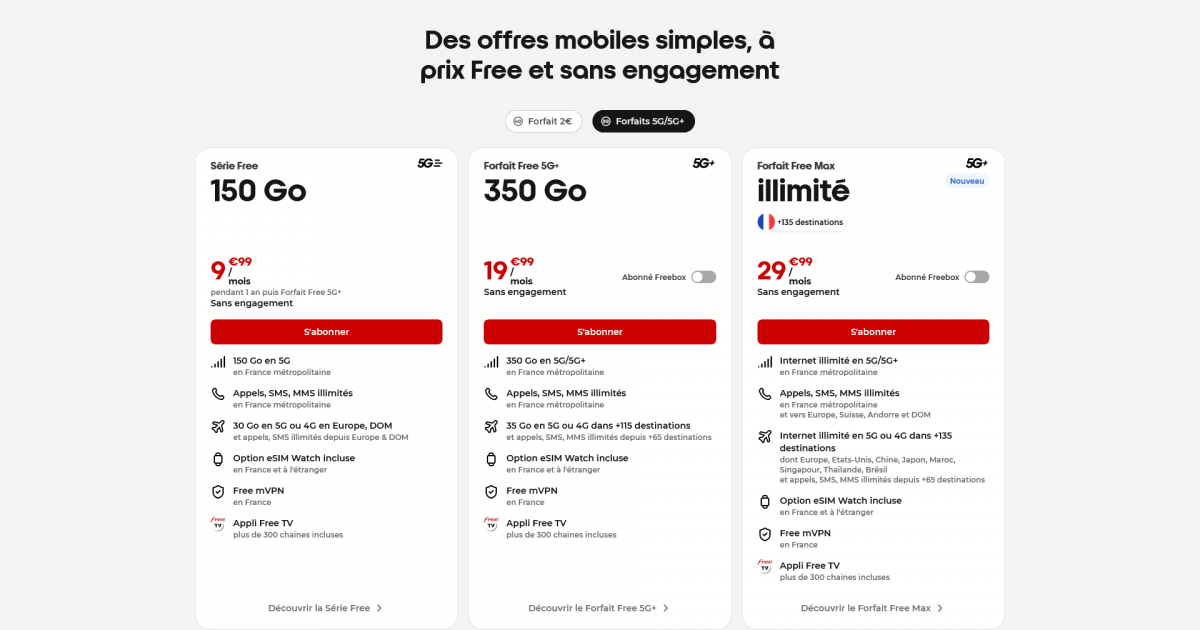 L’objectif est clair : simplifier la lecture des offres tout en valorisant les forfaits data, devenus centraux dans les usages mobiles. Avec cette nouvelle présentation, Free Mobile met en avant trois offres principales compatibles 5G, chacune répondant à des besoins différents, du plus accessible au plus complet.