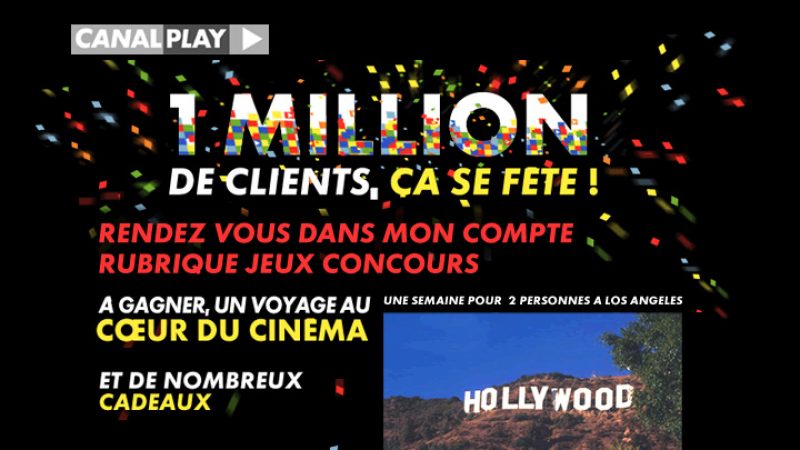 Canalplay fête ses 1 million de clients (toutes plates-formes confondues : Free, Numéricable, Bouygues Télécom et Canalplay.com). Pour l’occasion, Canalplay organise un grand jeu concours du 5/01/2010 au 31/01/2010 doté de lots intéressants :