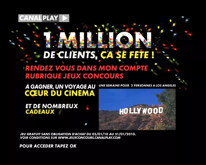 Canalplay fête ses 1 million de clients (toutes plates-formes confondues : Free, Numéricable, Bouygues Télécom et Canalplay.com). Pour l’occasion, Canalplay organise un grand jeu concours du 5/01/2010 au 31/01/2010 doté de lots intéressants :