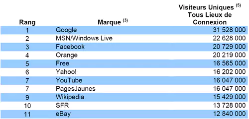 Médiamétrie vient de publier les audiences de sites Internet pour le mois de décembre. Comme le mois précédent, le domaine free.fr se classe toujours en 5ème position avec 16,565 millions de visiteurs uniques. Si les 4 premiers du classement se maintiennent par rapport à novembre, le domaine free.fr accuse une chute de 1,5 millions de visiteurs uniques.