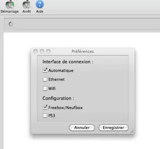 • Fenêtre de préférences pour forcer l’interface réseau (automatique, éthernet (en0) ou wifi (en1)) et sélectionner la configuration en fonction du matériel (Freebox/Neufbox ou PS3).