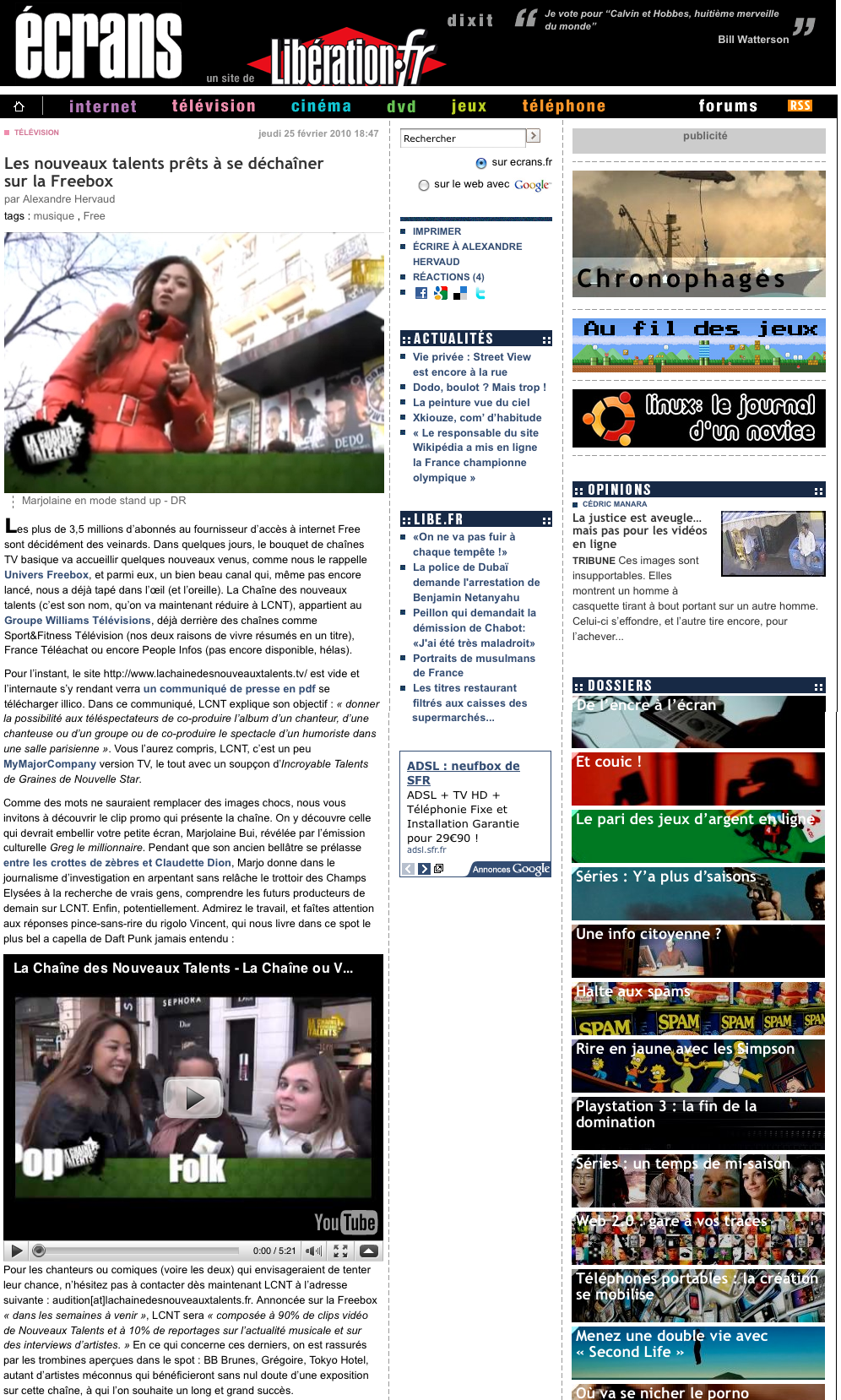 Les plus de 3,5 millions d’abonnés au fournisseur d’accès à internet Free sont décidément des veinards. Dans quelques jours, le bouquet de chaînes TV basique va accueillir quelques nouveaux venus, comme nous le rappelle Univers Freebox, et parmi eux, un bien beau canal qui, même pas encore lancé, nous a déjà tapé dans l’œil (et l’oreille). La Chaîne des nouveaux talents (c’est son nom, qu’on va maintenant réduire à LCNT), appartient au Groupe Williams Télévisions, déjà derrière des chaînes comme Sport&Fitness Télévision (nos deux raisons de vivre résumés en un titre), France Téléachat ou encore People Infos (pas encore disponible, hélas).