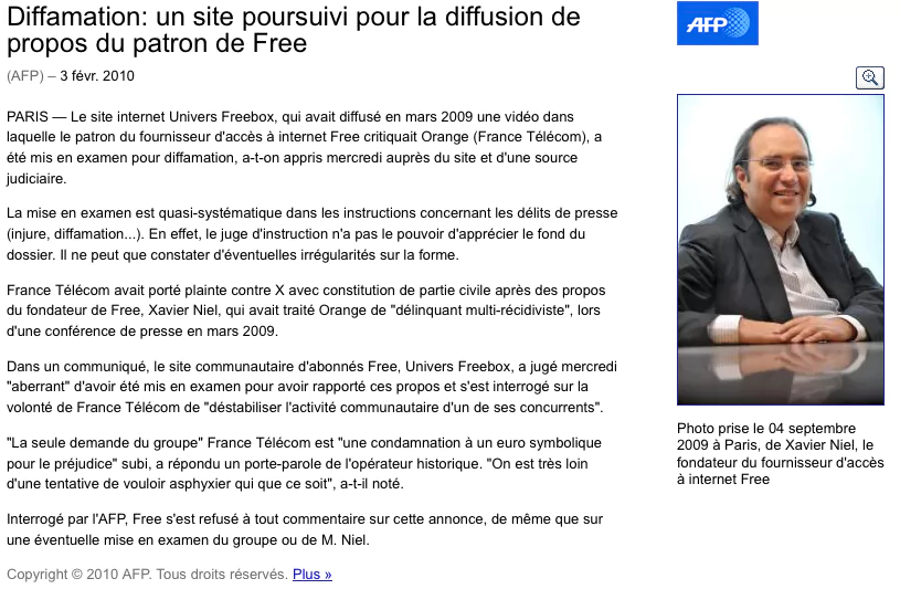 PARIS — Le site internet Univers Freebox, qui avait diffusé en mars 2009 une vidéo dans laquelle le patron du fournisseur d’accès à internet Free critiquait Orange (France Télécom), a été mis en examen pour diffamation, a-t-on appris mercredi auprès du site et d’une source judiciaire.
