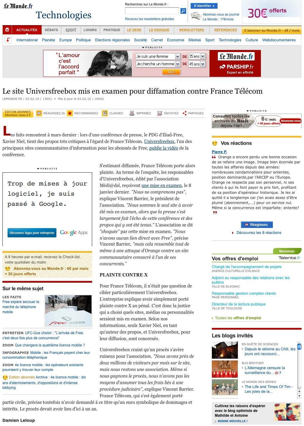 Les faits remontent à mars dernier : lors d’une conférence de presse, le PDG d’Iliad-Free, Xavier Niel, tient des propos très critiques à l’égard de France Télécom. Universfreebox, l’un des principaux sites communautaires d’information pour les abonnés de Free, publie la vidéo de la conférence.