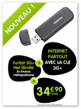 Accompagné d’une clé 3G+ (incluse) et d’une carte SIM (vendue 19€), l’offre « 3G+ Net Illimité » de Numericable est facturée 34,90€ par mois avec un engagement minimum de 12 mois et un dépôt de garantie de 150€. Elle est composée d’un accès à internet 3G/3G+ en « Illimité ». Autrement dit, limité à 2Go par mois. Aucun dépassement ou hors forfait n’est possible (la limite d’usage a été fixée à 2Go mensuels). En cas de dépassement, le débit est réduit, mais le service n’est pas interrompu.