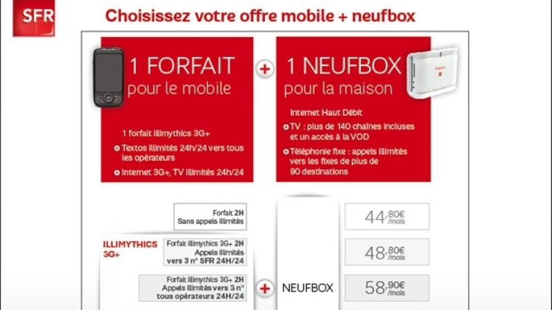 Dans cette étude est présentée aux sondés ce qui pourrait être l’offre quadruple play de SFR. Différentes offres sont ainsi présentées, allant du forfait 2h mobile à 44,80 euros par mois au forfait illymythics 3G+ 3 heures + appels illimités de 19h à 8h ainsi que le week end, à 79,90 euros par mois. Des tarifs calqués sur ceux de l’offre Idéo de Bouygues Télécom.