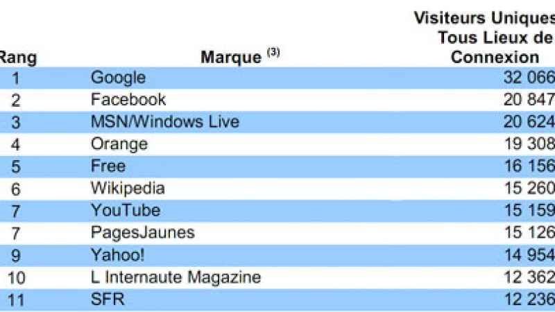 Le seul changement dans le top 5 des sites les plus fréquentés est la deuxième place prise par Facebook à MSN/Windows Live.