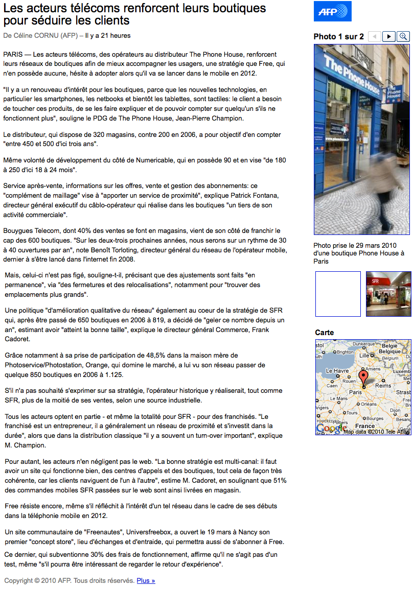 PARIS — Les acteurs télécoms, des opérateurs au distributeur The Phone House, renforcent leurs réseaux de boutiques afin de mieux accompagner les usagers, une stratégie que Free, qui n’en possède aucune, hésite à adopter alors qu’il va se lancer dans le mobile en 2012.