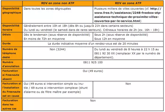 La newsletter de l’ADUF, dans son édition d’aujourd’hui, propose un tableau récapitulatif des conditions d’intervention dans les zones couvertes par l’assistance technique de proximité de Free. Dans les zones non couvertes par cette assistance technique à domicile gratuite, Free propose également un service similaire, mais les conditions diffèrent.