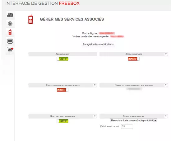 Free vient de faire évoluer la page de gestion des services téléphoniques sur la console de gestion des abonnés. Plus graphique, cette nouvelle interface permet de visualiser en un seul coup d’œil quels sont les services activés. Comme auparavant vous pouvez gérer les services suivants : Abonné absent, Protection contre tous les renvois, Rejet des appels anonymes, Restriction de présentation d’identité, Transfert inconditionnel, Transfert sur non réponse, Appel en instance, Renvoi vers messagerie, restriction des appels sortants et transfert sur occupation. Pour chacun de ces service, une aide est disponible en cliquant sur « ? »