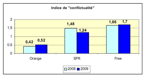 Ainsi, la contribution de SFR à cette amélioration est la plus significative. Dans ce contexte, Orange voit sa part de plaintes Internet augmenter mais conserve un indice de conflictualité « Internet » nettement plus faible que ses concurrents. L’indice de conflictualité de Free augmente lui légèrement (passant de 1,66 à 1,7) et reste toujours le FAI qui concentre le plus de plaintes.
