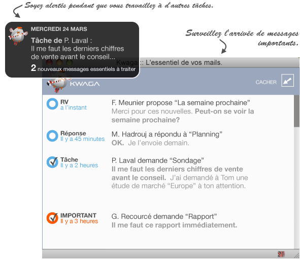 La technologie sémantique brevetée sur laquelle s’appuie Kwaga BirdsEye permet d’alerter les utilisateurs qu’ils soient ou non connectés à leur messagerie et « surveille » jusqu’à 5 comptes mails différents dans la version gratuite.