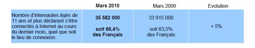 En mars 2010, 66, 4% de la population se sont connectés à internet au cours du mois. Ils sont 35, 6 millions de personnes âgées de plus de 11 ans à s’être connecté pendant cette même période. Les connexions en haut débit progressent aussi par rapport à mars 2009 (11%). 32, 6 millions d’internautes ont accès au haut débit depuis leur domicile.