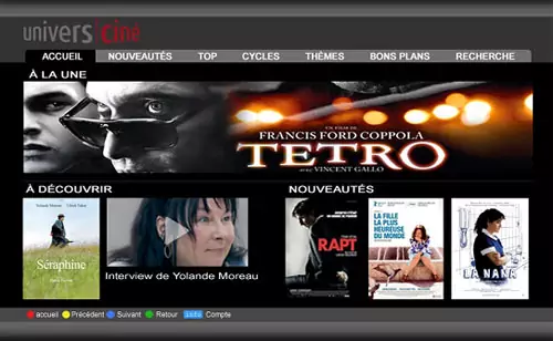 Tout d’abord Univers Ciné qui se définit comme le meilleur du cinéma indépendant en version Originale sous-titrée ». Vous pourrez y retrouvez des centaines de films en VoD à partir de 3,99 euros l’unité. Quelques reportages et interview sont également proposés gratuitement. UniversCiné est disponible sur la Canal 107 de Freebox TV