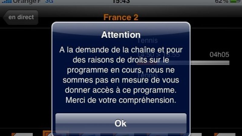 Les abonnés à l’option TV d’Orange se disent alors qu’il vont pouvoir bénéficier des matches de Roland Garros sur les chaînes de France Télévisions. Mais surprise, ceux-ci, pourtant disponibles gratuitement sur France 2, France 3 et France 4, sont bloqués et le message suivant apparait :