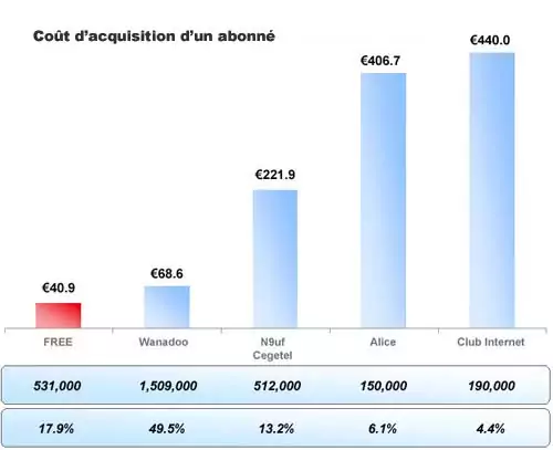 Pourtant, fait quasiment unique, Free qui dépense jusqu’à 10 fois moins que ses concurrents en publicité pour capter un abonné, réussi à maintenir ses parts de marché et a recruter plus que les autres FAI alternatifs. Si bien que le coût d’acquisition d’un nouvel abonné est rentabilisé en quelques mois chez Free alors qu’il faudra attendre plusieurs années avant qu’il ne le soit chez 9 télécom ou Club internet. Ce tableau reflète bien la disproportion des coûts d’acquisition par rapport au recrutement de nouveaux abonnés.