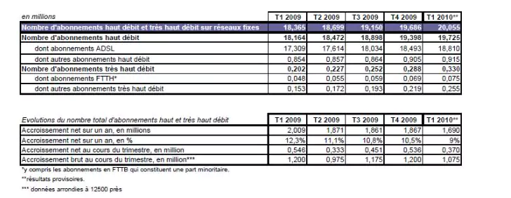 Au 31 mars 2010, le nombre d’abonnements haut et très haut débit sur réseaux fixes supportant l’accès à internet atteint 20,06 millions. Sur un an, l’accroissement net est de 1,69 million (+9%). Le volume de ventes brutes réalisé par les fournisseurs d’accès à internet s’élève à 1,075 million au premier trimestre de 2010.