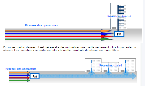 Au contraire, les zones moins denses ne bénéficient pas d’un réseau dédié de bout en bout. Il est donc nécessaire de mutualiser une partie nettement plus importante du réseau. Dans cette optique, les opérateurs se partagent alors la partie terminale du réseau mono-fibre.