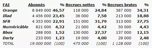 FAI qui recrute le plus avec 387 000 abonnés bruts. Mais c’est également l’opérateur qui concentre le plus de résiliations avec 269 000 abonnés qui ont quitté l’opérateur.