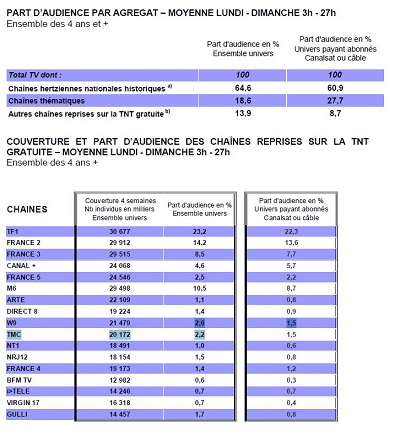 Du côté des chaînes historiques, TF1 remporte la plus grosse par du gâteau avec une audience de 23, 2%. W9 se place en tête des chaînes de la TNT avec une part d’audience de 2, 6%. Le classement est le même pour l’univers payant.