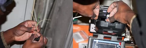 Le technicien a donc sélectionné la paire de fibres optiques arrivant sur le pallier de l’immeuble, soudé correctement la fibre. La soudure reste une étape cruciale qui assure un débit et une fiabilité de la connexion. Le technicien a utilisé une "cliveuse" pour réaliser une coupe au profil parfait. Cette machine permet aussi de souder la fibre par un grand flash lumineux.