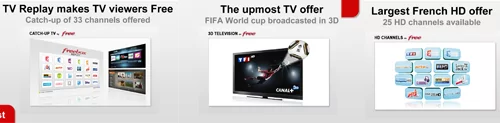 Les 33 chaînes disponibles sur sa catch-up, les 25 chaînes accessibles en haute définition et la diffusion, pendant la Coupe du Monde de TF1 en 3D, font de Free le fournisseur d’accès le plus innovateur en matière d’IPTV.