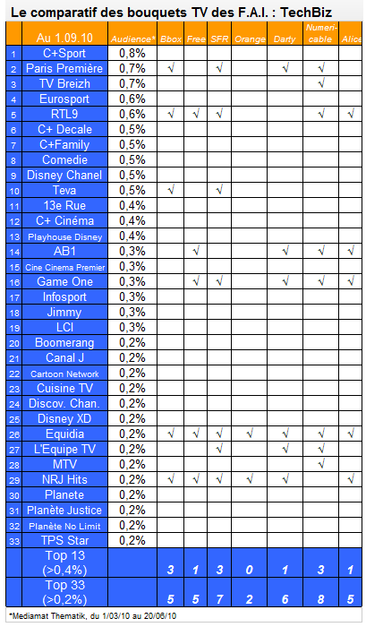 Toujours selon le même postulat, SFR arrive juste derrière le câblo-opérateur en proposant dans son bouquet basic 7 chaînes et Darty propose 6 stations. En queue de peleton, Free, Bouygues et Alice en proposent 5.
