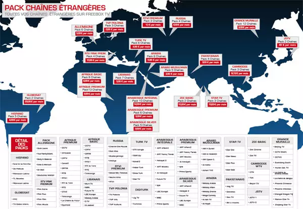 Le magazine des abonnés de Free du mois de novembre présente un récapitulatif de tous les packs de chaînes étrangères proposés sur Freebox TV. On constate qu’il sont ainsi au nombre de 23 et qu’ils couvrent une grande partie du monde. Bien sûr, en plus de ces packs payants, des chaînes gratuites ou payantes d’autres pays sont proposées (Japon, Etats Unis,etc.)