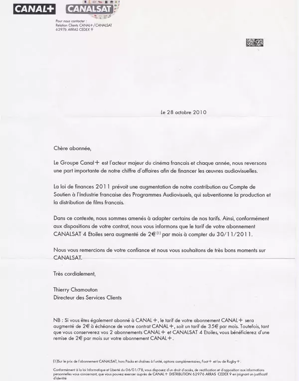 Univers Freebox vous informait mardi que le tarif de Canal+ allait être majoré de 2 euros par mois suite à l’augmentation de la contribution au COSIP de Canal+ imposée par le gouvernement. Comme on pouvait s’y attendre, le tarif de Canalsat va également augmenter de 2 euros par mois. Les abonnés à ce bouquet commencent en effet à recevoir un courrier de Canalsat leur annonçant cette augmentation. En réalité, et contrairement à ce qu’annonçait jeanmarcmorandini.com, cette augmentation n’impactera pas les abonnés à une date fixe, mais à échéance de leur contrat..