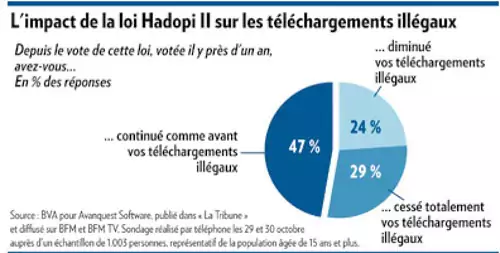 Selon un sondage BVA-« La Tribune » publié ce jeudi, 53% des adeptes du piratage ont arrêté ou réduit leur pratique depuis le vote de la loi Hadopi. Interrogé par le journal, Bruno Vanryb, PDG de l’éditeur de logiciels Avenquest indique que « la loi Hadopi n’est donc pas forcement un gadget déconnecté des réalités que l’on pouvait imaginer. Ce résultat souligne l’importance de la psychologie dans l’impact éventuel d’une législation, et l’influence limitée des militants du téléchargement gratuit pour tous ».