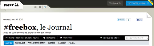 L’application vous permet aussi de générer un journal sur n’importe quel sujet (en utilisant les tags présent dans les tweets des utilisateurs du monde entier). Par exemple, http://paper.li/tag/freebox qui reprend les infos les plus importantes sur Twitter traitant de l’actualité de Free des dernières 24 heures.