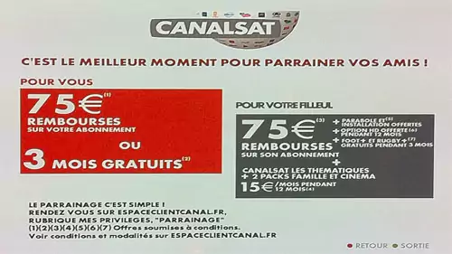 Canal vient d’ajouter une chaîne dédiée au parrainage sur le canal 249 de l’univers Canal+ et Canalsat. Celle-ci présente les nouvelles offres dont bénéficient les abonnés s’ils parrainent un nouvel abonné. Cette chaîne n’est cependant pas interactive puisqu’il n’est pas possible de souscrire aux offres présentées depuis son téléviseur. Celles-ci sont cependant plus intéressantes que les dernières offres promotionnelles proposées sans parrainage :