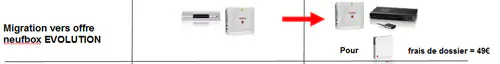 Si la procédure de migration vers la prochaine Freebox n’est pas encore connue, Univers Freebox s’est procuré des documents internes indiquant comment celle-ci se passera chez SFR. La surprise est que pour les abonnés actuels, la migration vers la nouvelle offre NeufBox Evolution à 34,90 euros/mois, ne signifie pas un changement des 2 boitiers. En effet, les abonnés SFR migrant vers cette nouvelle offre ne recevront que le nouveau décodeur TV. S’ils souhaitent bénéficier également du nouveau boitier ADSL, ils devront débourser 49 euros.