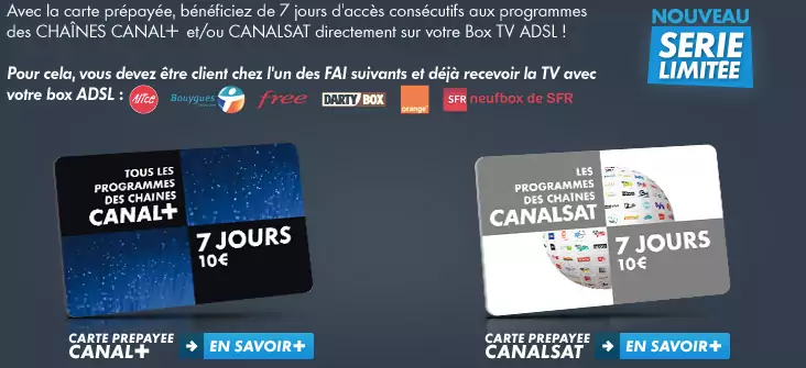 Le groupe Canal + propose des offres prépayées aux abonnés adsl. Valable pendant sept jours d’accès consécutifs aux programmes des chaînes Canal + et (ou) CanalSat, elles sont disponibles en magasin (Carrefour, Darty, Boulanger) ou par téléphone.