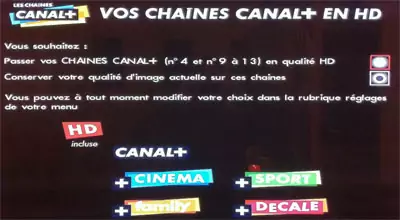 La procédure est cependant différente de celle de Freebox TV. Si dans le bouquet de Free, la qualité peut être définie chaîne par chaîne (ou automatiquement en fonction du débit), Canal+ et CanalSat proposent de choisir la version SD ou HD pour l’ensemble des chaînes disponibles. Pour ce faire, il suffit de se rendre sur le canal 8 de l’univers Canal+/Canalsat et de choisir le basculement en haute définition des chaînes concernées. Il est bien sûr possible de revenir aux versions SD à n’importe quel moment.