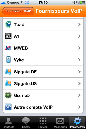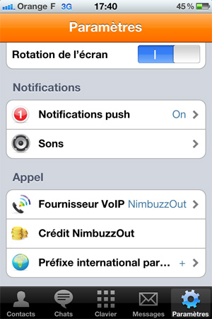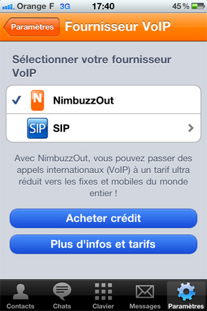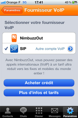 Pour l’iPhone nous allons utiliser l’application Nimbuzz, il en existe d’autres comme Fring par exemple (disponible également sur Android)