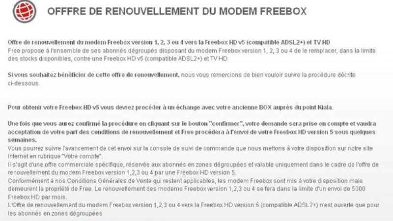Bonne nouvelle pour les abonnés dégroupés qui disposent encore d’une Freebox V4. En effet, selon nos constatations et vos témoignages, depuis ce matin, les abonnés concernés disposent d’une nouvelle ligne sur leur console de gestion Free leur indiquant « Renouveler ma Freebox par une FBX HD V5 Sans Frais ».