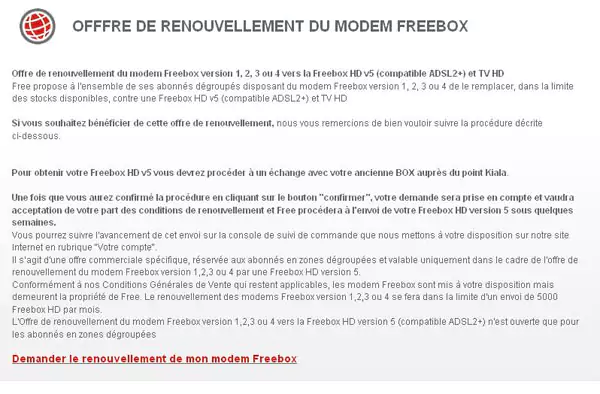 Bonne nouvelle pour les abonnés dégroupés qui disposent encore d’une Freebox V4. En effet, selon nos constatations et vos témoignages, depuis ce matin, les abonnés concernés disposent d’une nouvelle ligne sur leur console de gestion Free leur indiquant « Renouveler ma Freebox par une FBX HD V5 Sans Frais ».