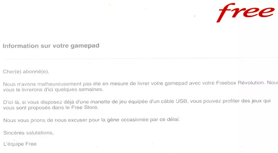 Enfin, nous vous indiquions que les gamepad (manettes de jeux) n’étaient pas livrés avec la freebox v6. Cela est confirmé par un courrier de Free dans le colis.
