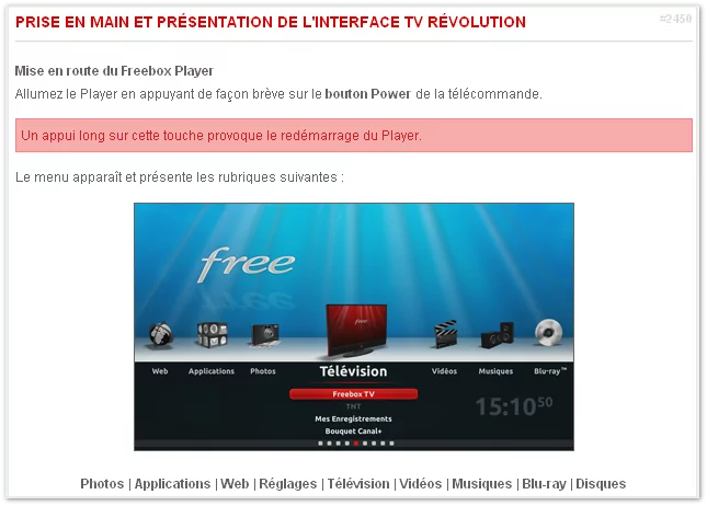 Il y a quelque jours, Free confiait à UniversFreebox que « des tutoriels seront accessibles dès la semaine prochaine » pour accompagner le lancement de la nouvelle Freebox Révolution. Et bien, c’est chose faite ! Depuis quelques instants, le site de l’assistance des abonnés arbore de nombreux renseignements et explications pour utiliser simplement l’interface TV et les fonctionnalités de la Freebox V6 Révolution (utilisation du lecteur Blu-Ray, du navigateur internet, etc). Les nouvelles fiches sont reparties dans dix rubriques :
