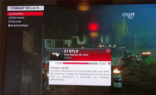 Ce mode s’ajoute à l’affichage letterbox qui permet en particulier de mieux respecter l’intégrité du format cinématographique ou télévisuel d’origine sans trop recadrer l’image, ni la déformer, au mode plein écran et PanScan (consiste à recadrer à l’intérieur de l’image d’origine, une portion de cette image pour la faire correspondre aux proportions de l’écran sur lequel il est affiché) déjà actif sur le boitier HD de la V5.
