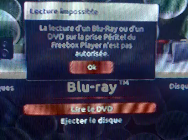 C’est par un laconique mais non moins explicite message que Free – via la mise à jour 1.0.1 du player – confirme l’impossibilité de visionner un DVD ou un Blu-Ray sur un téléviseur relié avec une péritel à la Freebox player…