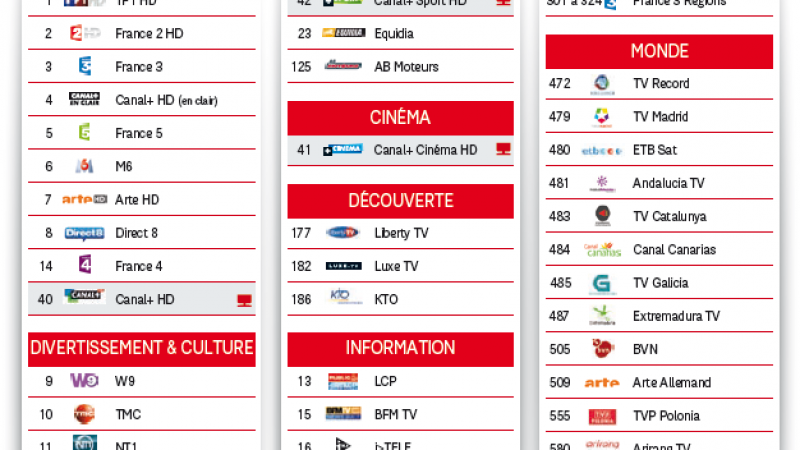 Les utilisateurs de la TV par satellite SFR accèderont à 80 chaînes dont certaines en haute définition, les 19 chaines de la TNT et, pour la plupart des autres, des chaînes étrangères. Pour en bénéficier les clients se verront proposer un décodeur TV HD satellite disponible en location pour 5 €/mois.