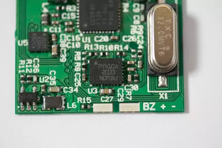 Elle dispose d’un circuit imprimé simple et de petite taille. Il n’y a bien sûr pas de transmission infrarouge. La télécommande se limite à une communication par radio.