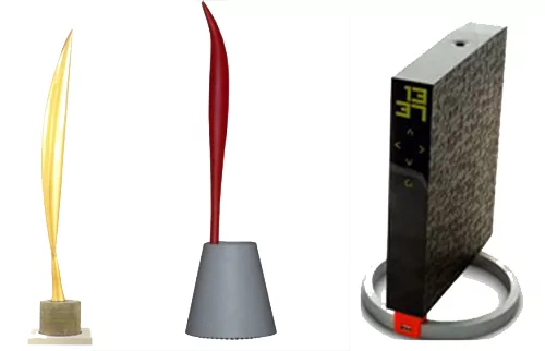De gauche à droite : l’Oiseau de Constantin Brancusi, la brosse à dent de P Stark et la Freebox Révolution