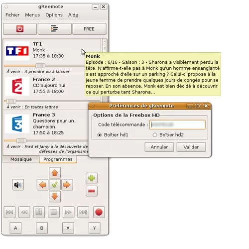 GReemote, fonctionne parfaitement sur Freebox HD, et est en cours de portage pour freebox Révolution (la plupart des fonctionnalités sont déjà opérationnelles). Il s’agit d’une application open source, sous licence GPL, et permet donc à n’importe qui de la modifier et de l’améliorer.